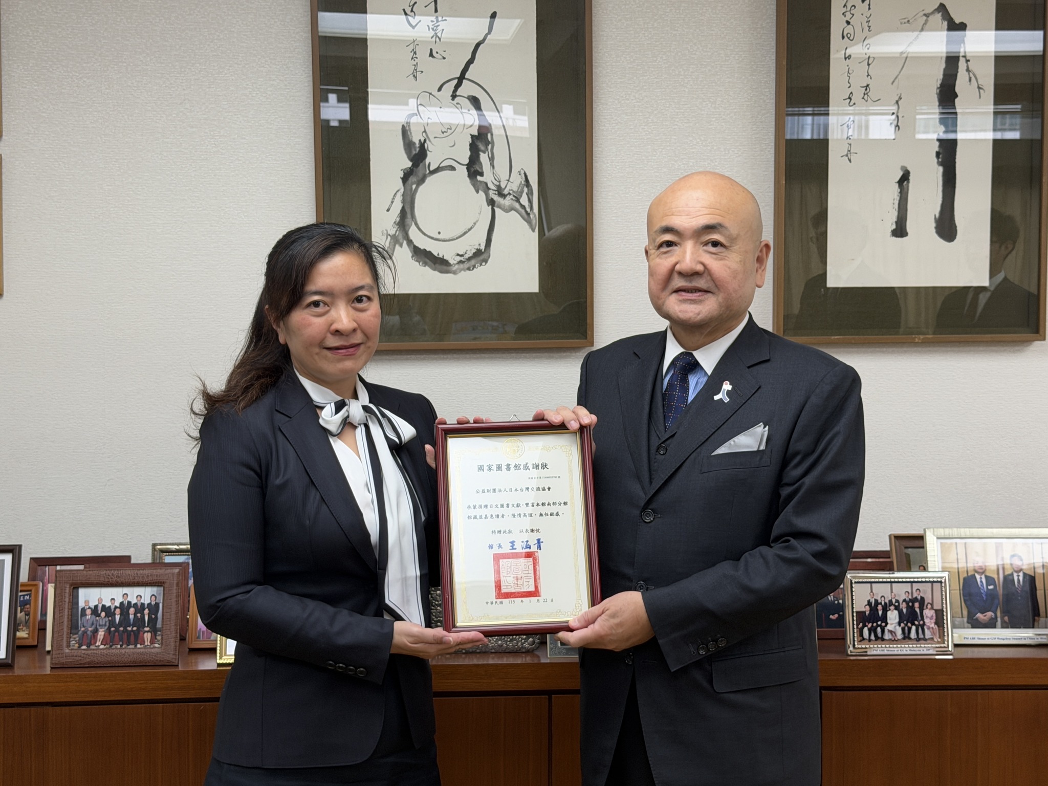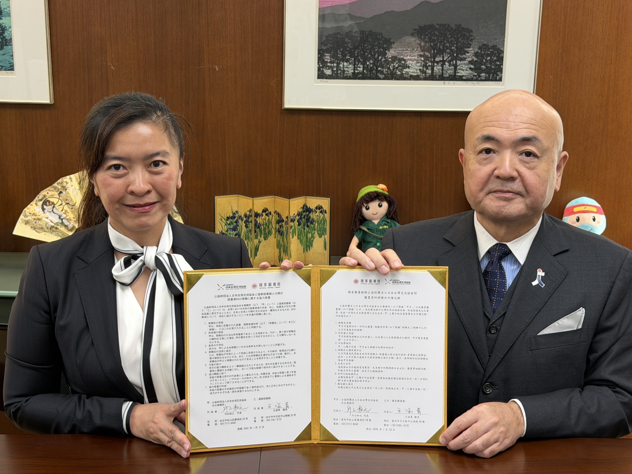 2026年1月22日(木)、当所において、国家図書館への図書資料寄贈に関する協力覚書の署名式を執り行いました。寄贈される図書は、当事務所ライブラリーに所蔵していた約3万冊に上り、寄贈後は本年下半期に開館予定の国家図書館南部分館(台南市新営区)に収蔵される予定です。 今回の寄贈を通じて、これらの書籍が日台友好の一助となり、台湾の皆様にとっても有意義な資料となることを心より願っています。また、署名された覚書には、図書の寄贈のみならず、今後の協力関係の強化についても盛り込まれています。 署名式には、国家図書館の王涵青館長、周倩如主任、張秀蓮簡任視察、当所の片山代表、荒木広報文化部長が出席しました。