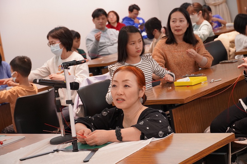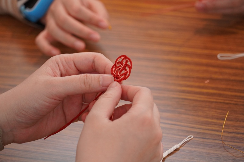 午後の部では、親子連れの方々を対象に、水引の基本の結びを応用した「梅のストラップ」のワークショップを行いました。親子で協力して作品を完成させ、当初はうまくいかずに少し表情が曇っていたお子様も、講座終了後にはご自身の作品を満足げに見つめるなど、大変楽しんでいただけたようでした。