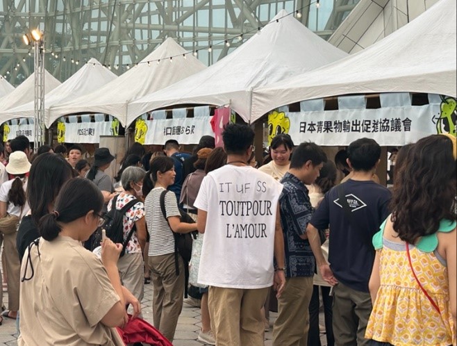 日本青果物輸出促進協議会(日青協)は、日本食品海外プロモーションセンター(JFOODO)と連携してブースを出展しました。日青協によるフルーツ祭への出展は、一昨年、昨年に続いて3度目となりました。ブースでは、日本産のりんご、桃、ぶどうの食べ比べ体験を行い、来場者が列に並んで試食を楽しむ様子が見られました。また、会場ステージで、日青協が台湾のインフルエンサーとコラボしたパフォーマンスを行いました。日本産青果物に関するクイズや記念写真撮影も行われ、多くの来場者が積極的に参加し、盛況なイベントとなりました。