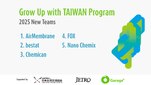 スタートアップ向けアクセラレーション・プログラム「Grow up with Taiwan Program」では、以下の5社を採択いたしました。多数の企業にご応募いただき、ありがとうございました。
