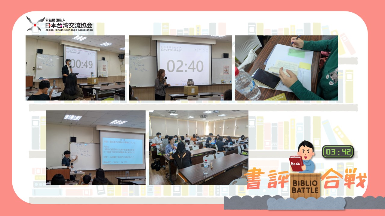 11月15日(土)、国立台中科技大学にて、日本台湾交流協会台北事務所の小嶋香織日本語専門家による日本語教師向け研修会「授業にビブリオバトルを取り入れてみよう!」が開催され、大学、民間日本語学校、高校などで教える日本語教師17名が参加しました。研修会ではまず、ビブリオバトルのルール確認から始まり、次に参加者は4グループに分かれて3分間のミニビブリオバトルを体験しました。未経験者が大半を占める中、熱心に本を紹介していました。また、日本語教育への導入事例紹介にも深く耳を傾けていました。最後に各グループのチャンプ本を持ち寄り、ファイナルバトルを実施しました。白熱したプレゼンテーションが繰り広げられ、太田愛作『犯罪者(上・下)』がチャンプ本に選ばれました。 実施後のアンケートには「ビブリオバトルを授業に取り入れたい」とのコメントが複数ありました。また、何名かの先生からは、クラスでビブリオバトルを導入することにしたとの連絡も寄せられ、この研修会が参加者の実践意欲を高め、日本語教育におけるビブリオバトルの普及と定着に大きく貢献できたことがうかがえます。 当協会では、今後も様々なテーマで研修会を行いますので是非ご参加ください。