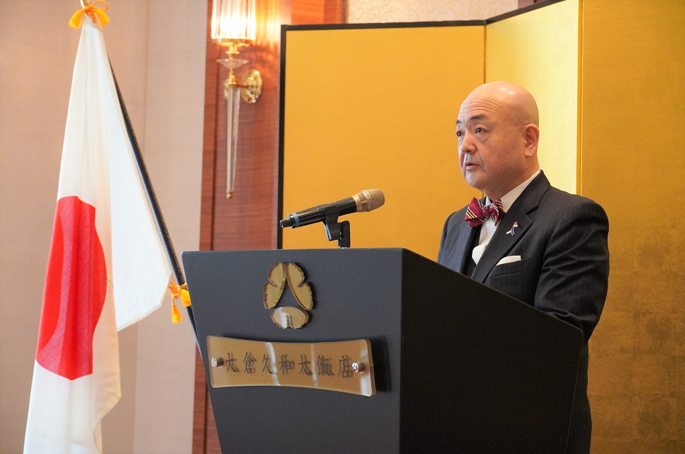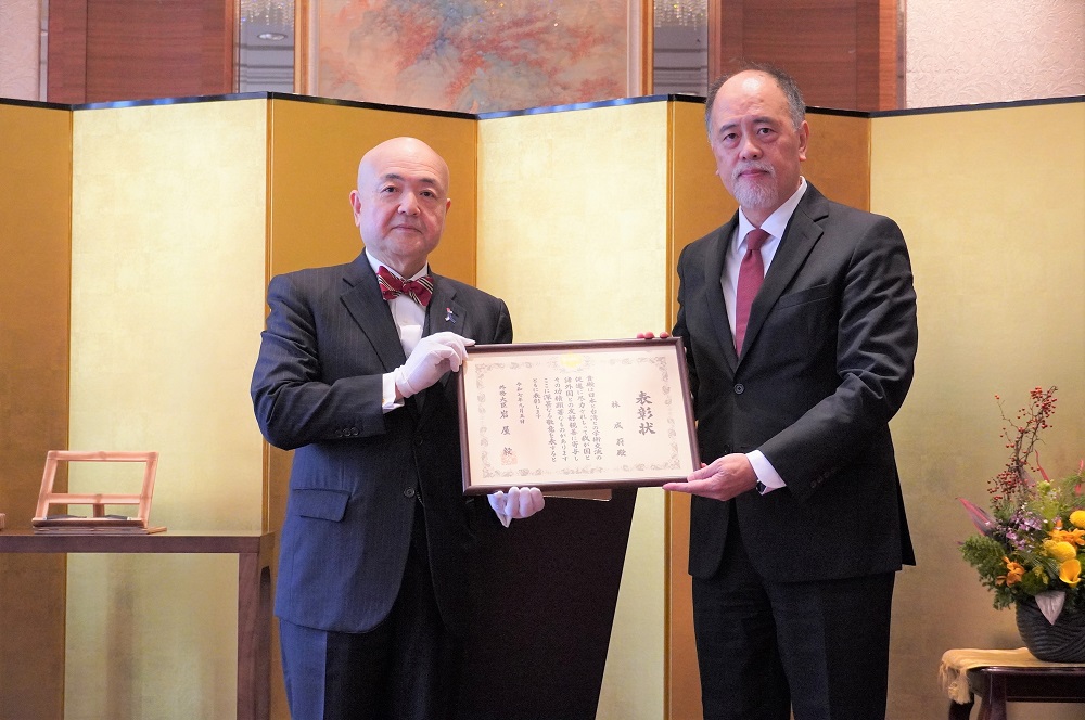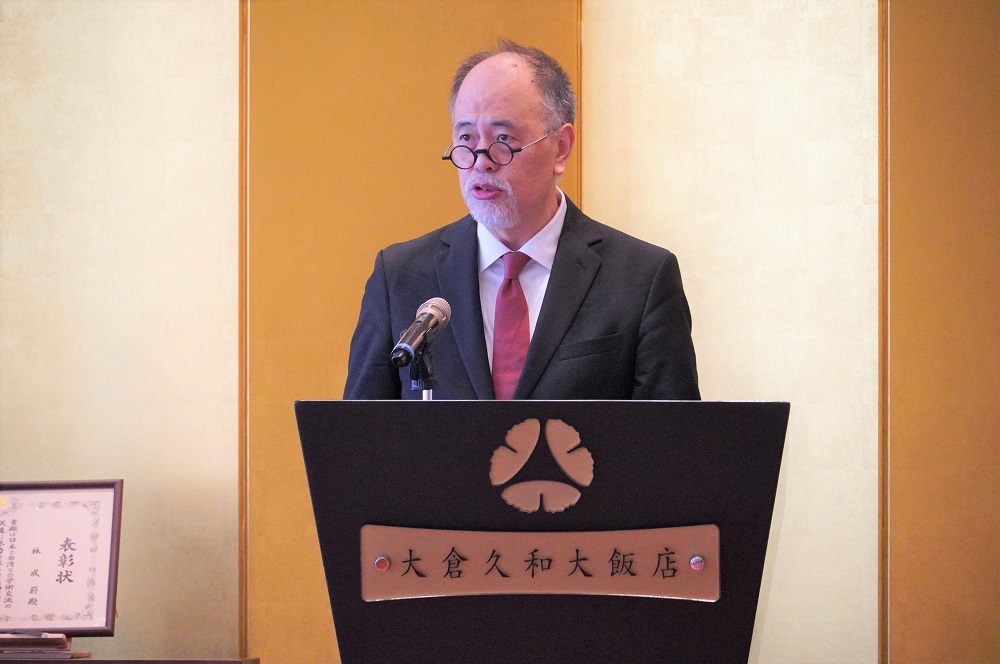 この度日本国外務大臣より、林成蔚様に対し、表彰を実施する運びとなりました。日本台湾交流協会を代表し、また、外務省の委任を受け、改めて心よりお祝い申し上げます。本外務大臣表彰は、日本・台湾間の友好親善及び相互理解の促進に対する、林成蔚様のこれまでの多大なる御功績を称えるものであります。私の台北在勤中に授賞が実現し、喜びも格別です。 私が林成蔚様と初めてお会いしたのは、確か2000年代前半の東京だったと記憶しています。その後、2006年に私が台湾外交部の招待で来訪した際に、総統府で国家安全会議諮詢委員であった林様と再会しました。そして、2年前、台湾に赴任するに当たり、東京六本木の国際文化会館でまたお会いし、最近の台湾情勢や両岸関係につき的確なアドバイスを頂きました。台北に着任して以降も、時折、食事をしながら、あるいは、蔡英文前総統との会見に同席されてお顔を拝見していました。今回、林様が外務大臣表彰を受けられるに当たり、この四半世紀の断続的な交流を深い感慨をもって思い起こした次第です。 私から改めてご紹介するまでもありませんが、林先生は東京大学博士課程修了後、台北駐日経済文化代表処代表室主任、台湾国安会諮詢委員、国防安全研究院執行長等を歴任し、多層的な日台交流の深化のためにご貢献してこられました。また、合計12年以上に亘って、北海道大学公共政策大学院、常葉大学法学部で教鞭を執り、これまで累計1,000名以上の学生が林様から台湾について学んでおり、日台間の相互理解促進、日台関係を担う人材育成等に多大な貢献をしておられます。 台湾政府は先月、福島第1原発事故に関連して残っていた日本産食品に対する輸入規制を撤廃しました。2022年2月に蔡英文前総統が福島等「5県産食品」の輸入解禁という大きな決断を下すに当たっては、林様の多大な貢献があったと伺っています。林様は、客観的・科学的根拠に則していない輸入規制措置は調整されるべきとの強い信念の下、台湾の政治状況も踏まえた現実的な規制緩和の具体策を提示し、大きな突破口を導きました。当時の蔡英文総統の御英断に改めて謝意を表するとともに、蔡総統のリーダーシップの下で尽力された林様のご貢献に対し、日本国民を代表し御礼申し上げます。 近年、日台の国民感情は史上最良の状態にあります。この関係を太く長いものとしていくため、引き続き林成蔚様のお力添えをいただきたく、お願い申し上げます。 最後になりますが、林成蔚様、ご家族並びにご列席の皆様の益々の御健勝と御多幸、また、2026年の日台関係が更なる発展を遂げることを祈念して、私からのお祝いの言葉とさせていただきます。本日は、誠におめでとうございます。