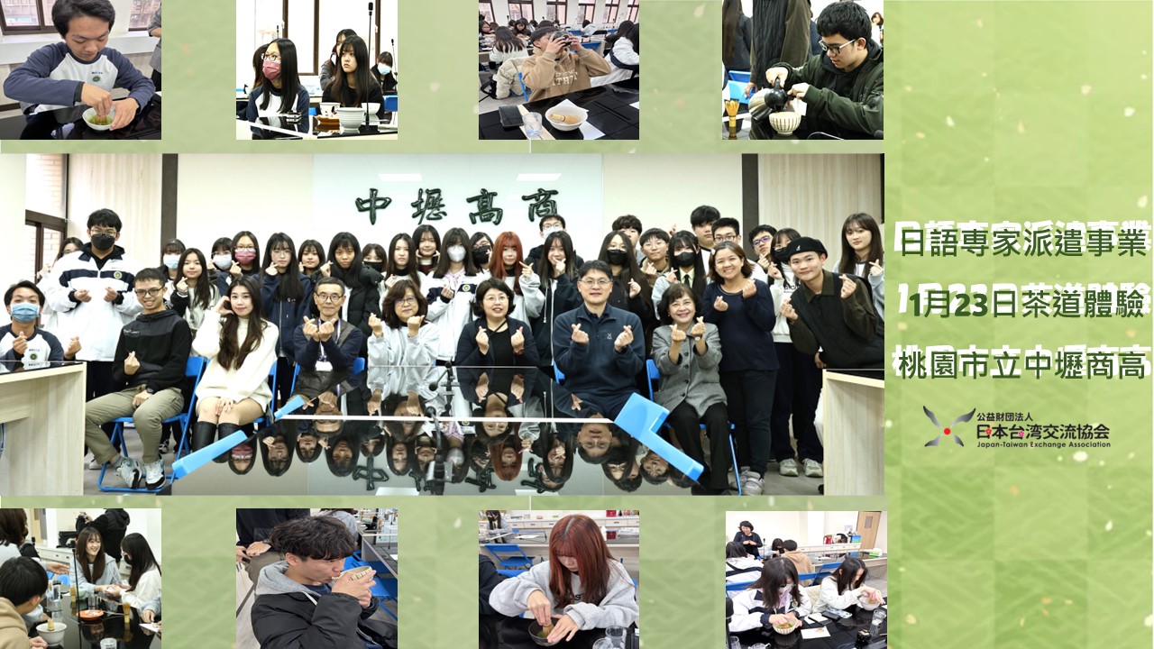 1月の日本語専門家派遣事業報告 担当:小嶋香織日本語専門家 1月23日(金):桃園市立中壢商業高校 参加者:38人(高校生35名、元智大学大学生3名) テーマ:茶道体験 1月23日に中壢商業高校日本文化クラブに所属する生徒35名を対象に専門家派遣事業を実施しました。今回は元智大学から3名の実習生もサポートとして参加しました。茶道クラスでは毎回、友達に飲ませてあげたいお気に入りの茶碗を持参することになっており、中壢商業高校の生徒たちも、かわいい絵や美しい花が描かれた茶碗を用意して参加しました。日本語専門家からお茶の点て方のポイントを聞いた後、実際に点てる際には、見本と同じように上手に点てられた生徒もいました。実施後のアンケートには、「抹茶を点てているとき、とてもリラックスできた」「抹茶の泡を立てるのは難しくて手が疲れた」といった感想が寄せられました。また、「一期一会“珍惜當下”という言葉が印象的だった」といったコメントもあり、生徒たちが日本語の言葉を深く理解しようとする姿も見られました。生徒たちはこのクラスを通じて、茶道に込められた日本の考え方にも触れることができたようです。 当協会では、日本語および日本文化体験活動の支援、日本語教育関連の勉強会・セミナーの実施など、日台交流活動促進のため、日本語専門家を派遣しています。詳しくはこちらをご覧ください。