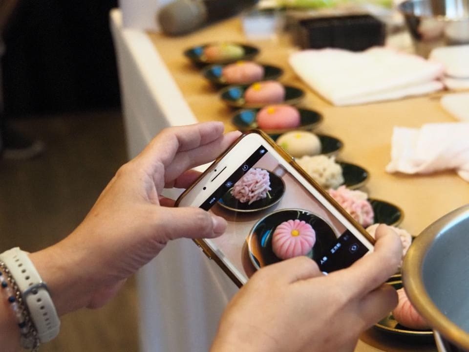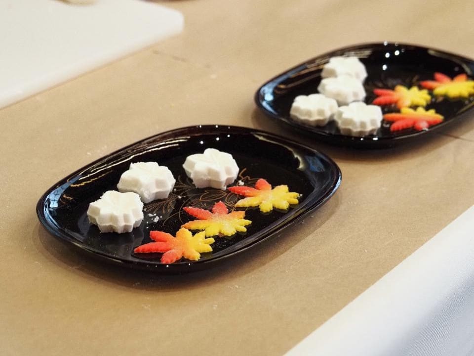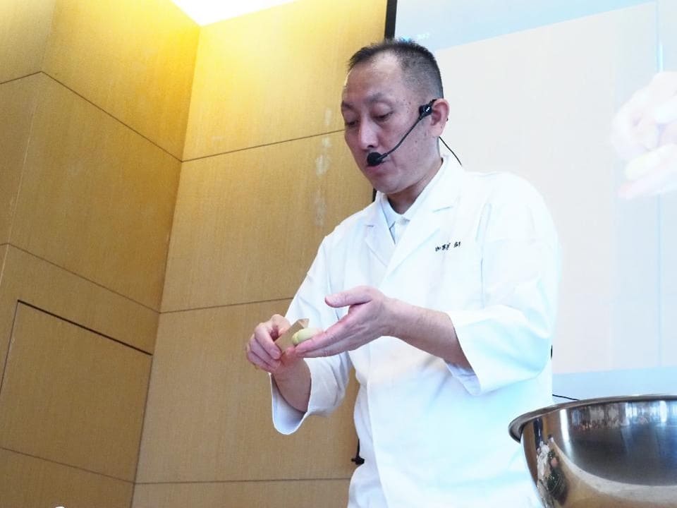 上午場是由1882年創立、位於京都西陣地區的塩芳軒第五代店主高家啟太先生,以「和菓子的歷史與美學」為題演講,從7、8世紀中國傳來的唐果物、13世紀禪宗的「饅頭」、16世紀受到葡萄牙文化的影響,之後如何獨自發展演變成今日的和菓子,舉例說明了日本的減法審美觀,並實際演示「京菓子的設計」,有華麗設計的Konashi(豆沙餡加入粉類蒸煮而成的和菓子),也有表現遠景及抽象風景的金團(用網篩擠成短條狀綴在球狀豆餡上的和菓子)。