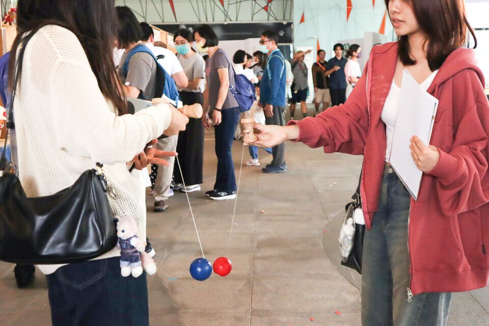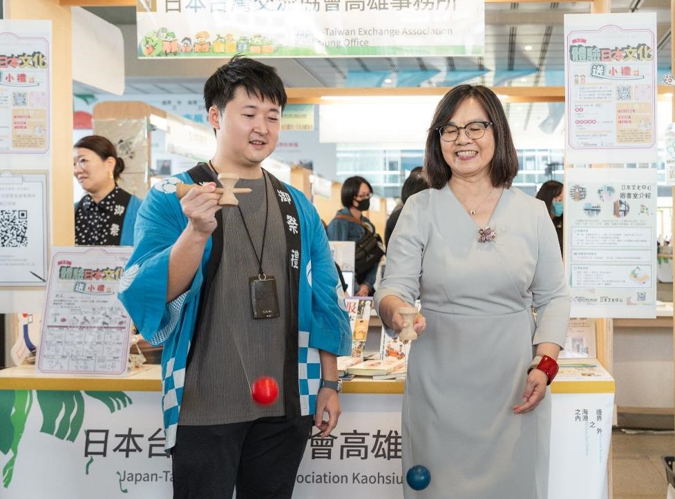 特別是劍玉體驗,高雄市立圖書館李金鴦館長及許多市民朋友也前來體驗各種不同的技法,感受這項日本傳統遊戲。無論男女老幼、國籍,藉此機會讓大家更加認識日本文化。
